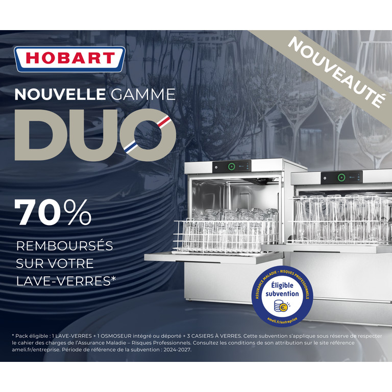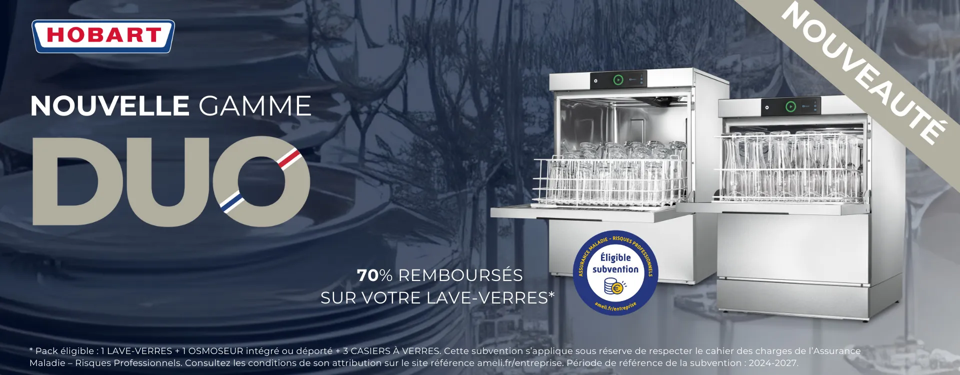 Chez Pro‑Electro.fr, nous vous proposons une sélection de lave‑verres HOBART et de machines de la gamme DUO compatibles avec ce dispositif, ainsi qu’un accompagnement pour le montage de votre dossier.